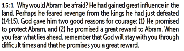 1Some time later, the Lord spoke to Abram in a vision and said to him, “Do not be afraid, Abram, for I will protect you, and your reward will be great.”