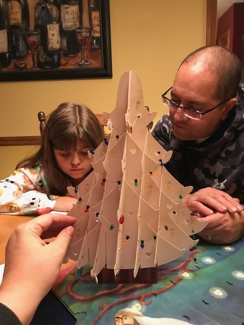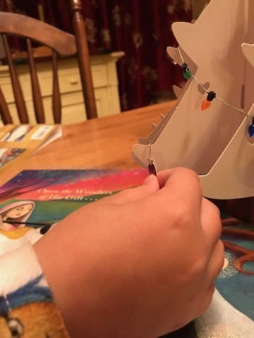 The Wonder of the Greatest Gift is a strikingly unique way to celebrate the Advent season. The fourteen-inch pop-up Jesse Tree doubles as a Christmas decoration, and as you get closer to Christmas, you add more and more ornaments to the tree. To make the Jesse Tree even more special to your family, you can customize the tree with glitter and spangles! Jackie Nunez, designer behind The Wonder of the Greatest Gift, spent an evening with her family using tiny string lights and spangles to make their Jesse Tree their own.