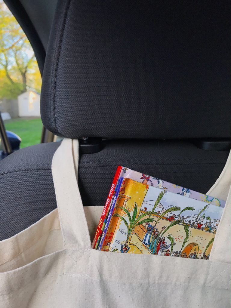 To make an activity kit, find an inexpensive canvas bag that you can hang over the headrest of your car. You could even buy one for each of your kids and let them decorate it with fabric markers.