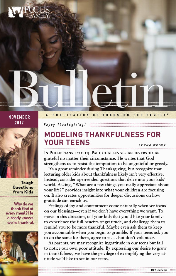 Focus on the Family’s global Christian ministry is dedicated to helping families thrive in today’s world. The Focus on the Family Bulletin is a publication designed to do just that. Each four-page bulletin features articles by respected family experts, coaches, and counselors eager to meet the needs of parents and their children. More than 700,000 monthly readers are also kept informed about current events that affect the family and ways to get involved.
