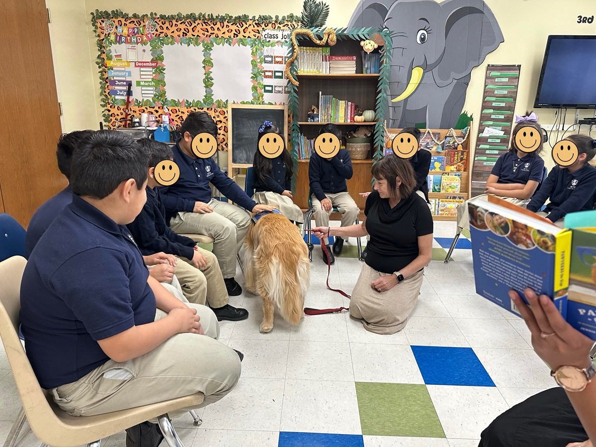 One of the stories in More Pawverbs for Kids (releasing this fall) is about a therapy dog named Tesla, whom Jen has featured in several Pawverbs stories. Tesla’s handler, Sandee, works with a therapy dog ministry outside of Chicago, Divine Dogs Sandee recently presented a morning assembly at a Christian school in Bartlett, Illinois. Many of the students there are reluctant readers.